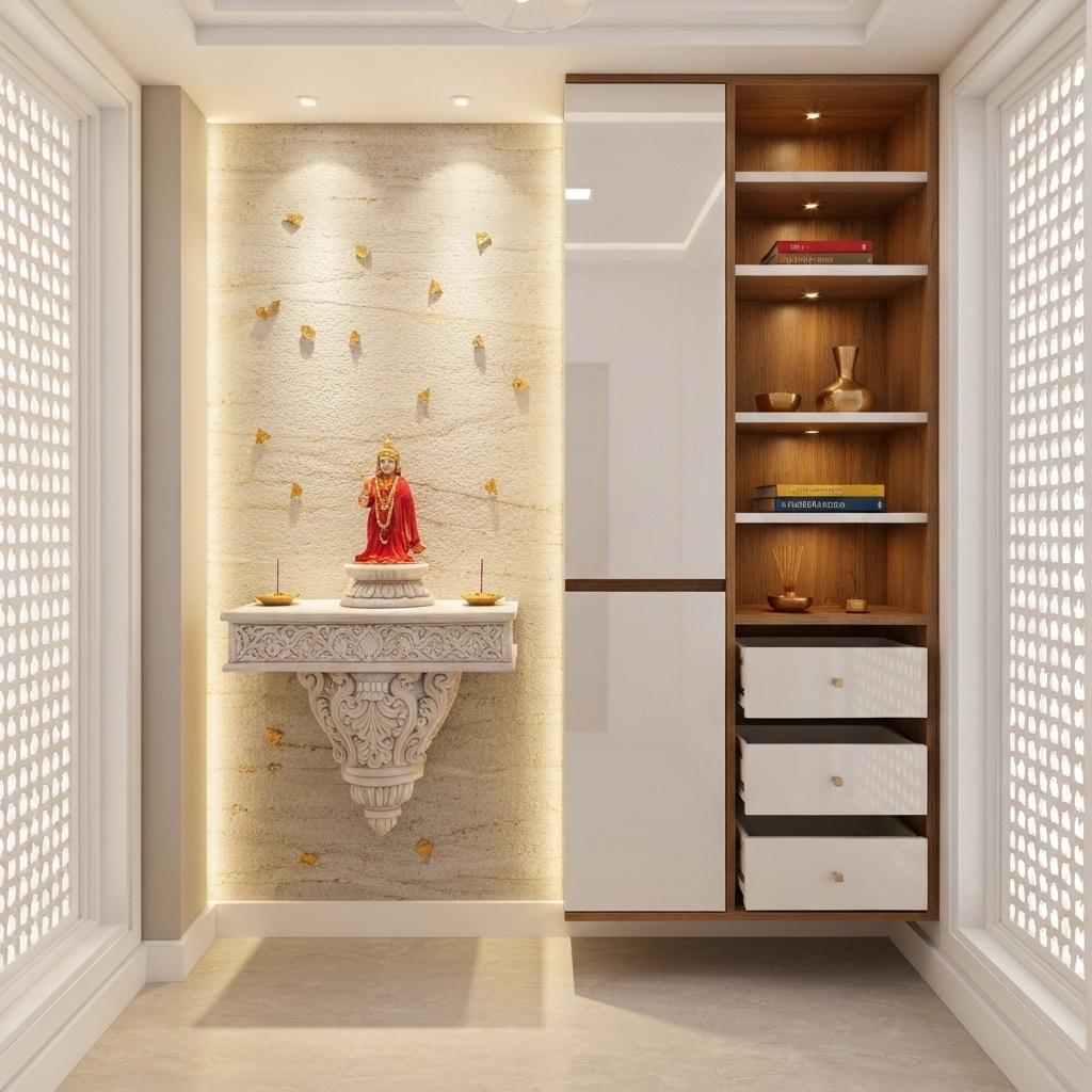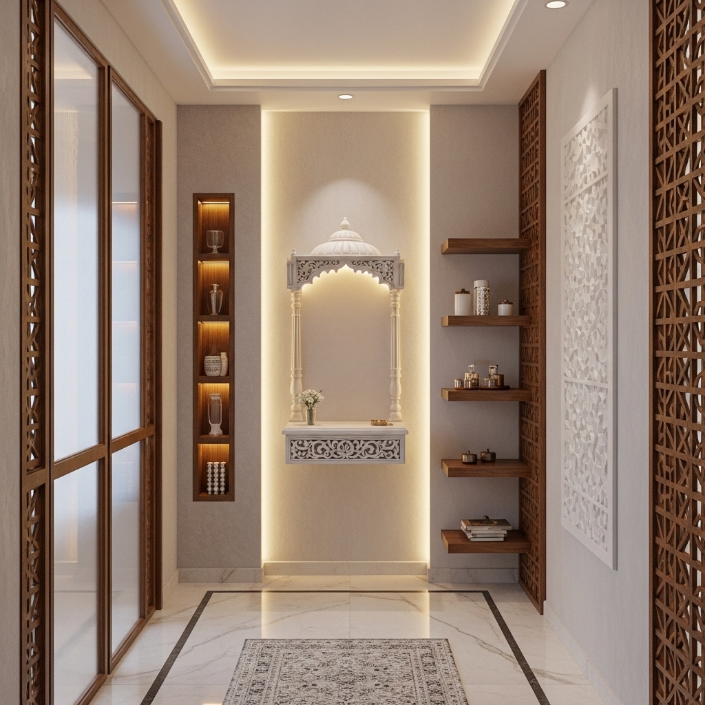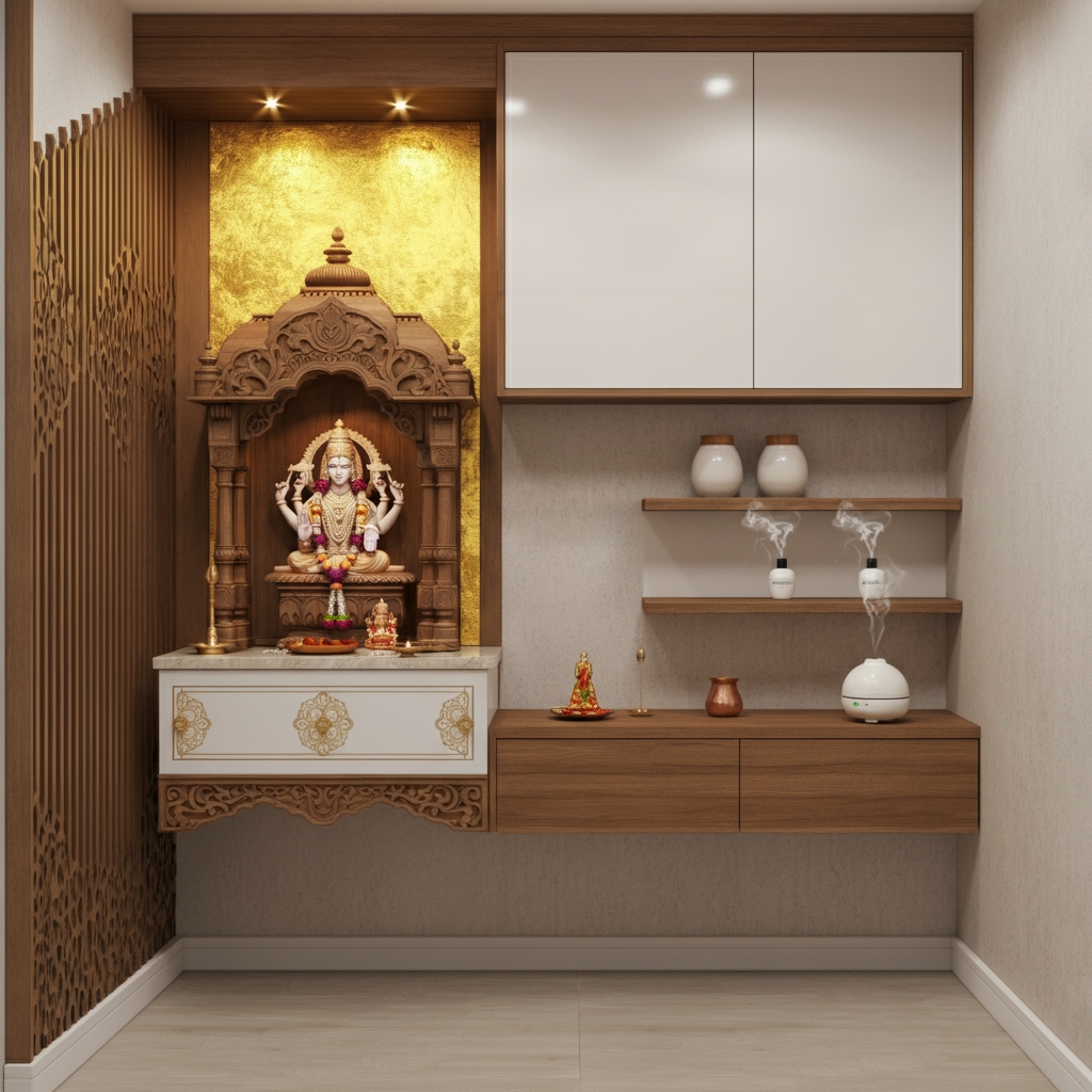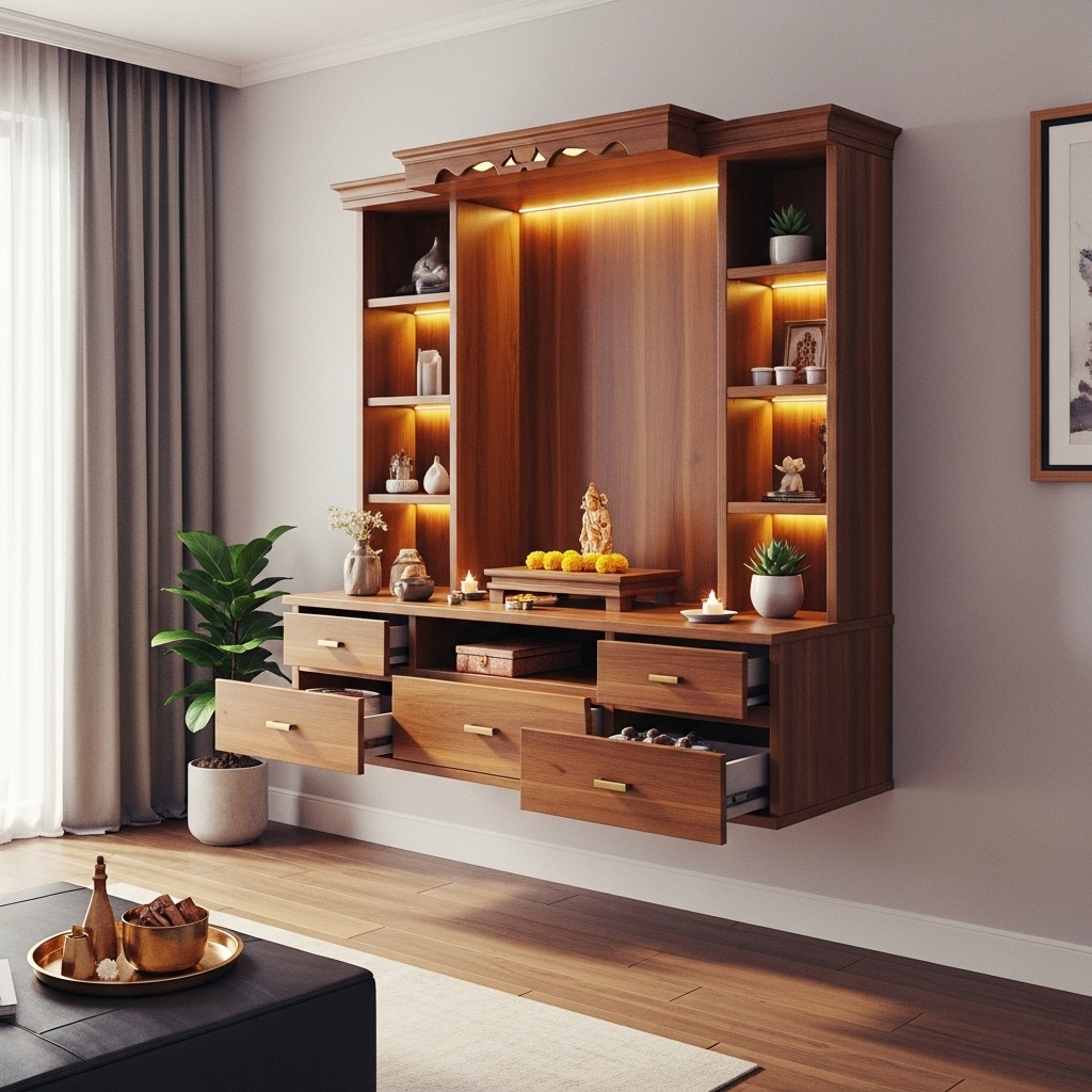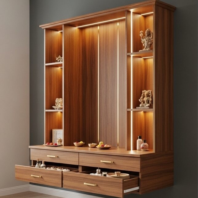 Sabse pehla rule — floor space ka waste mat karo. Wall-mounted mandir units aapka mandir ko eye-level pe respect dete hain aur neeche ka space free rakhte hain.