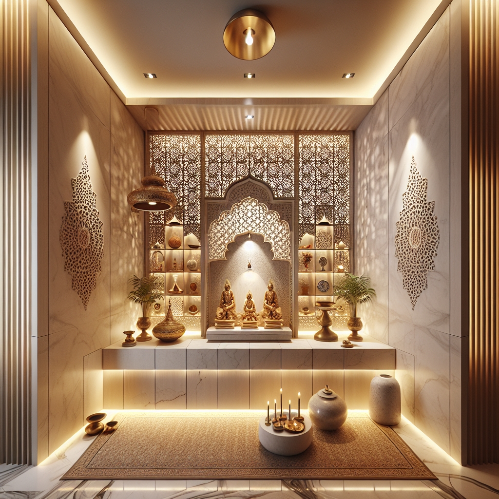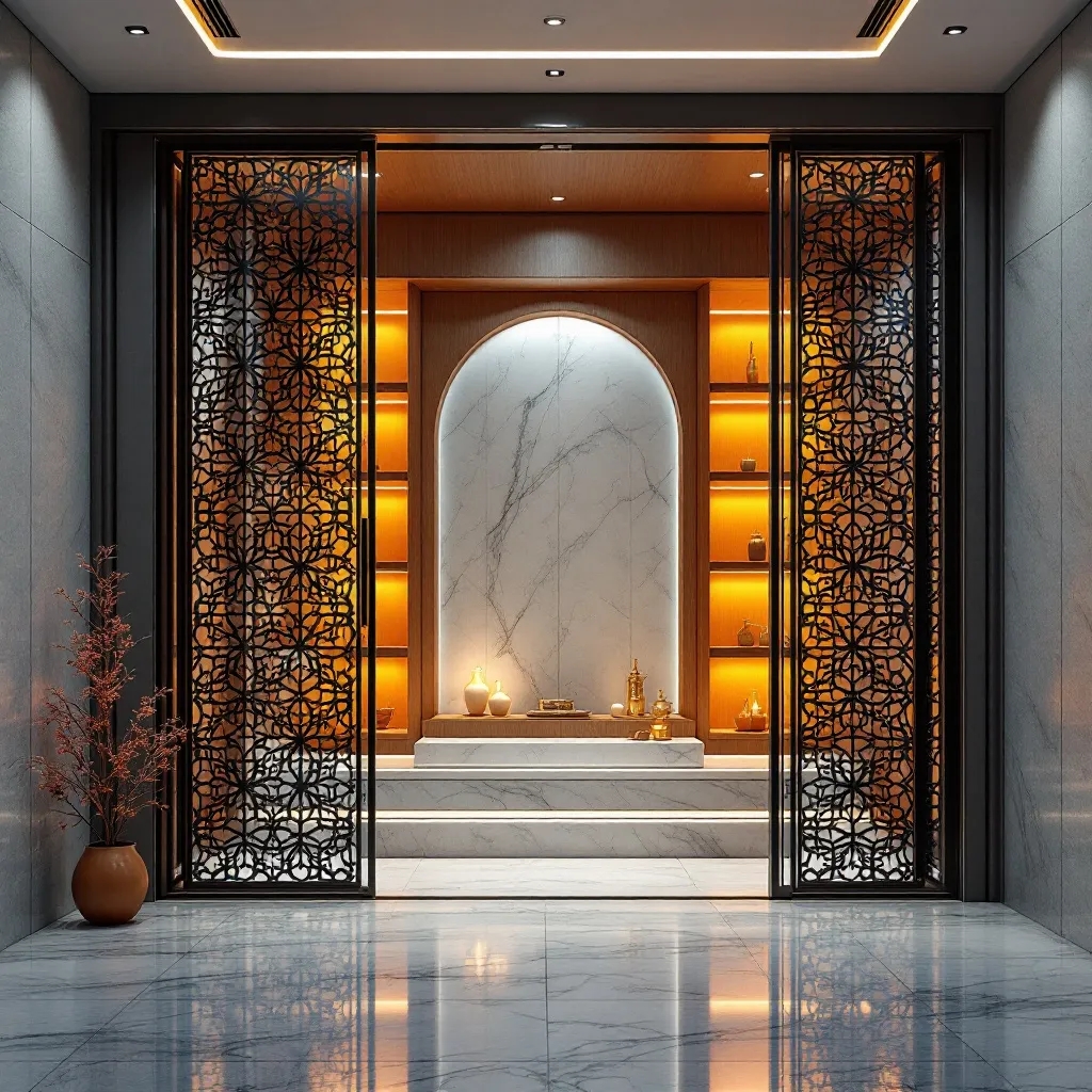 Marble ya wooden jaali designs pooja room ko royal feel dete hain aur ventilation bhi dete hain.