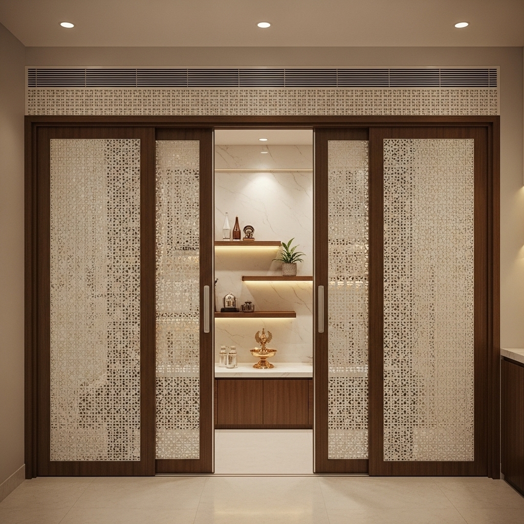 • Frosted glass with deity motif feels elegant and hides clutter.
