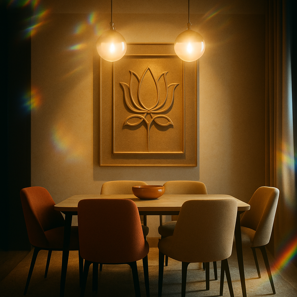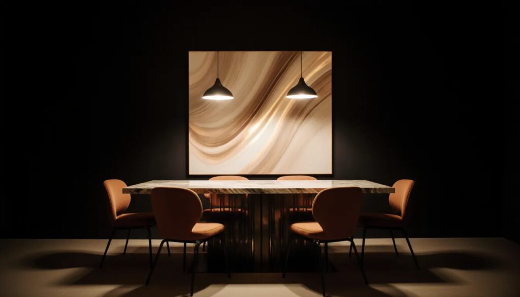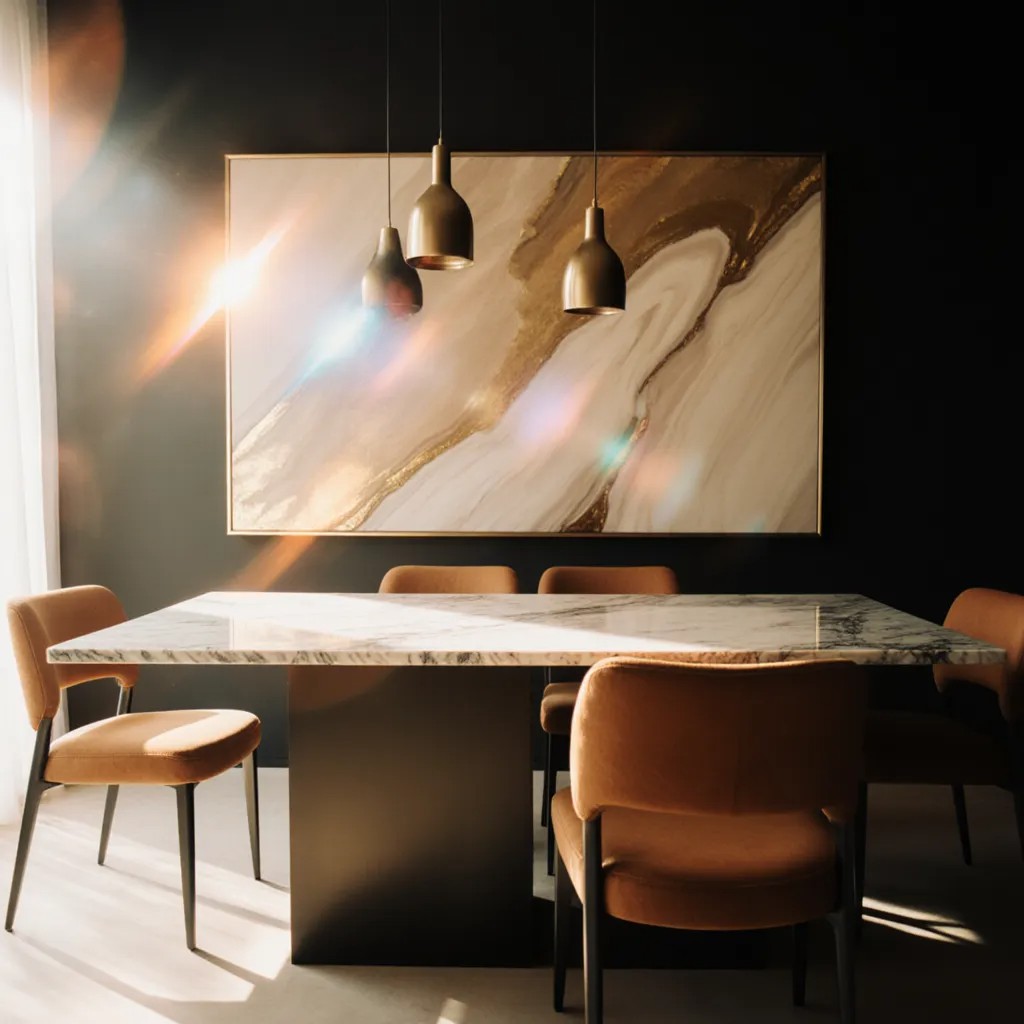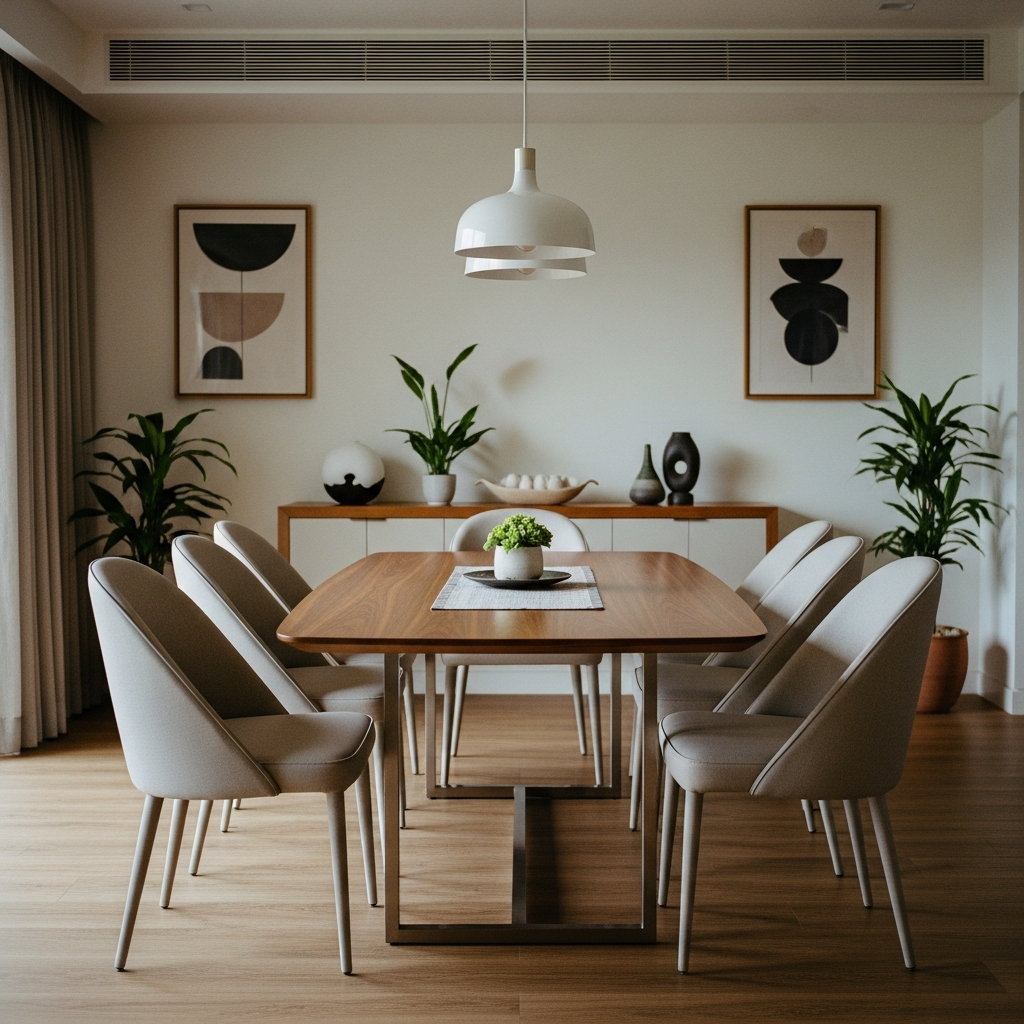 Pro-Architect Tip: Ek large art piece ya sculptural wall panel choose karein jo dining ka statement ban jaye.