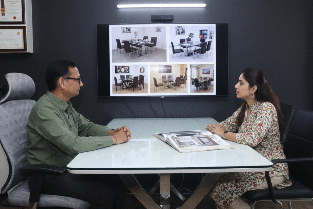 Aap chahe to ye saare tips apne aap apply karein… ya phir humse ek baar milkar apne dining ko hotel-level elegance + ghar ki warmth ka combo bana dein.