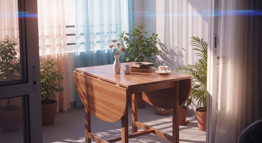 Drop-leaf table balconies ya semi-open dining areas ke liye perfect.
