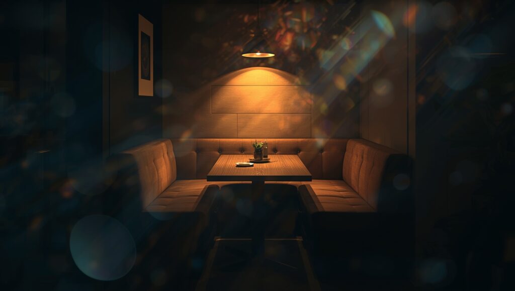 L-shaped bench in a corner = cosy café vibe.