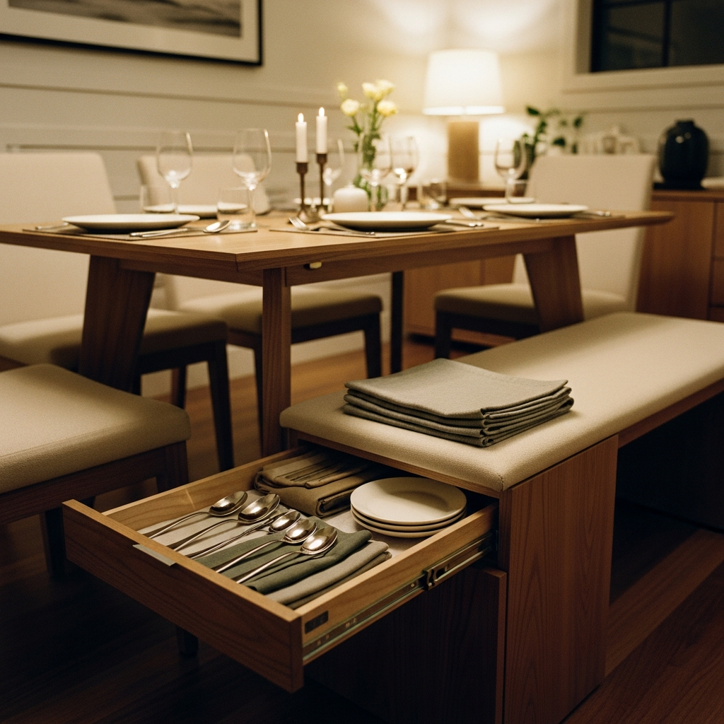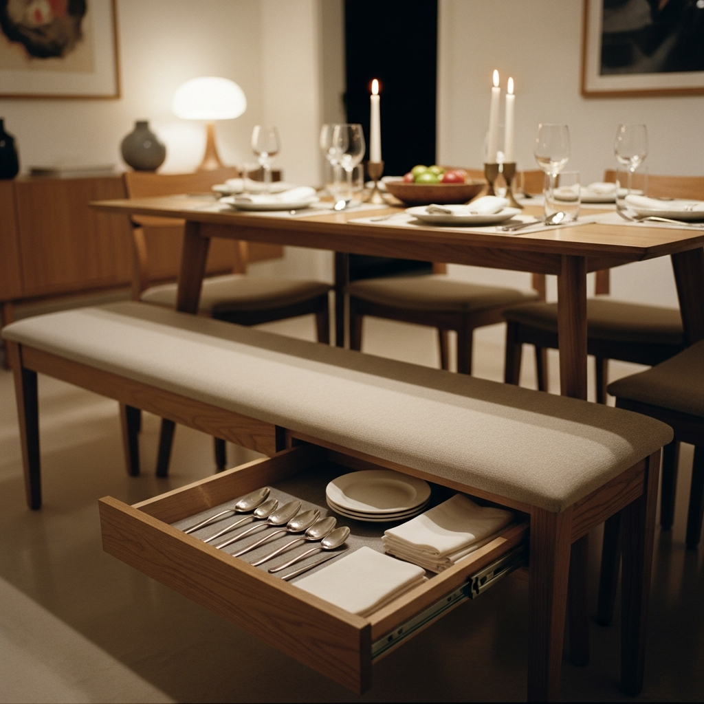 Architect’s Secret: Bench seating under-table slide hoti hai, floor space free hota hai.