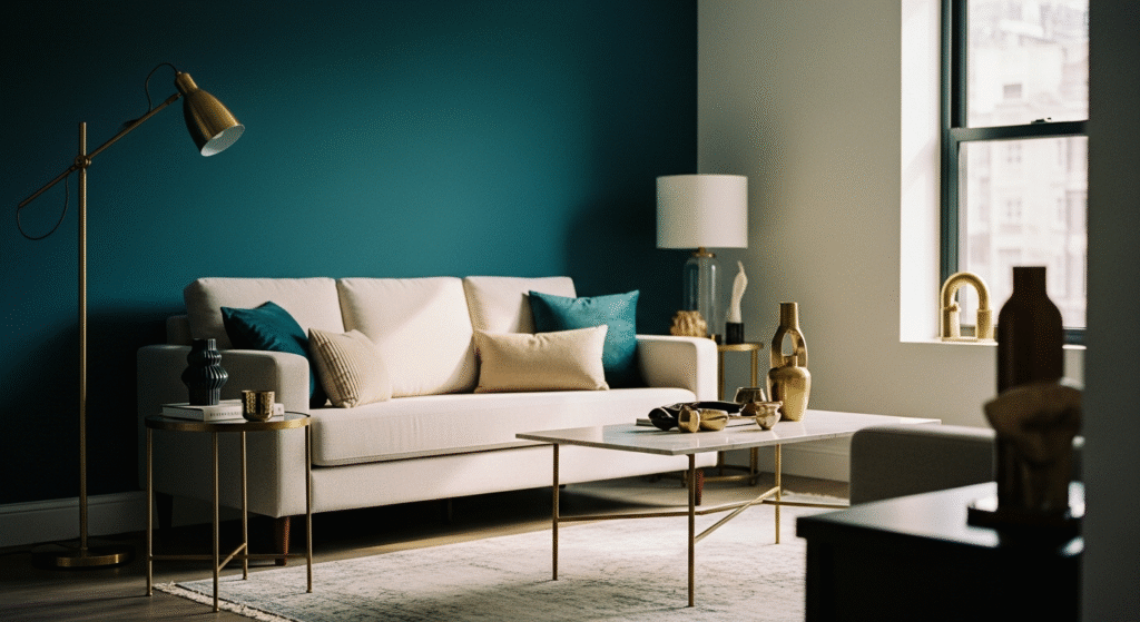 Contrast creates drama. Jaise ivory sofa + deep teal wall + brass accents.