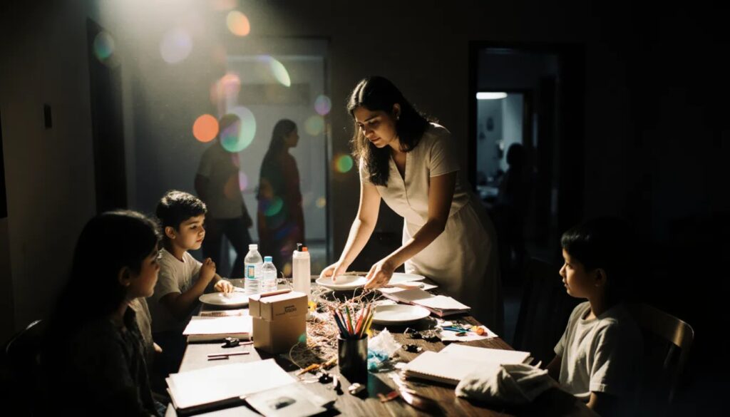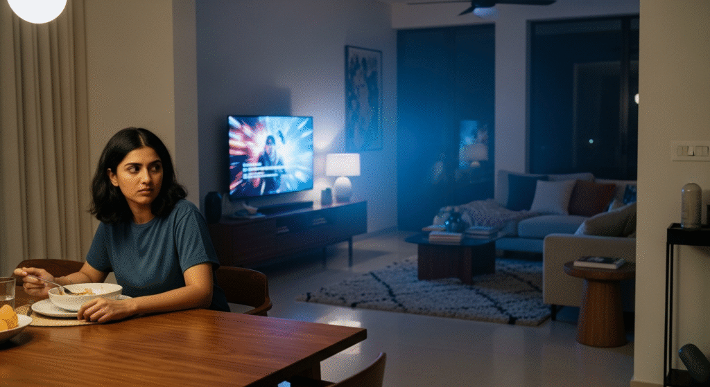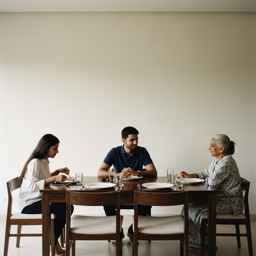 Sunday afternoon, puri family ghar pe hai. Kitchen me khushboo hai, par dining table pe rakhhe hue courier boxes, homework books, aur random chargers ka mountain bana hai.