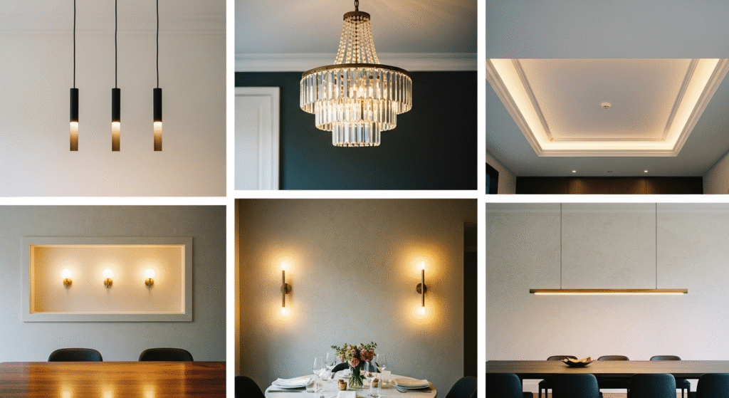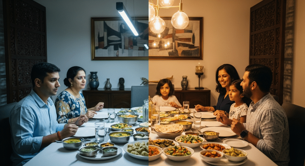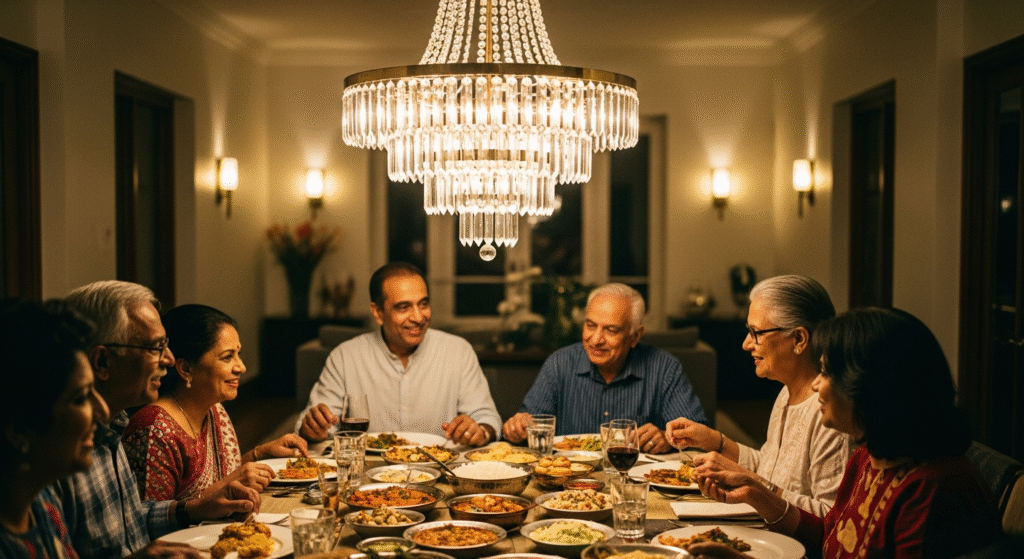 Solution: Chandelier ya pendant lights not only light up food but also spotlight family faces—warmth + beauty ek saath.