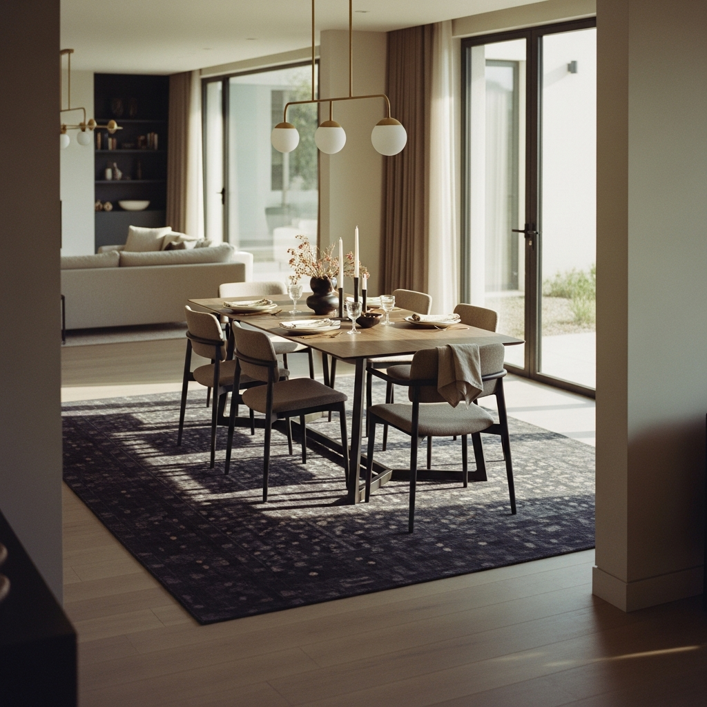 Solution: Low-pile rugs that extend under pulled-out chairs = style + practicality. Dark tones or patterns hide accidental spills.