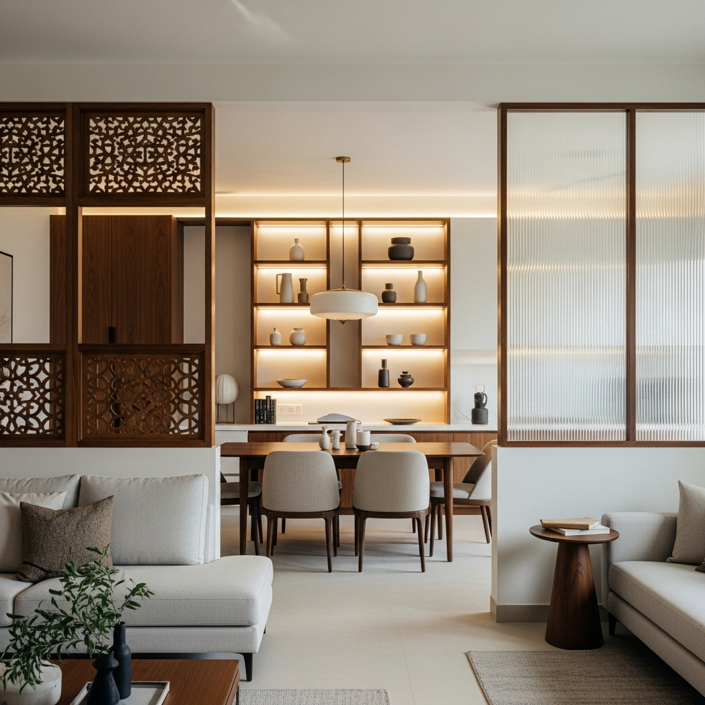 Solution: Jaali, open shelves, ya frosted glass panels soft division create karte hain—openness bhi rahe, boundaries bhi ban jaayein.