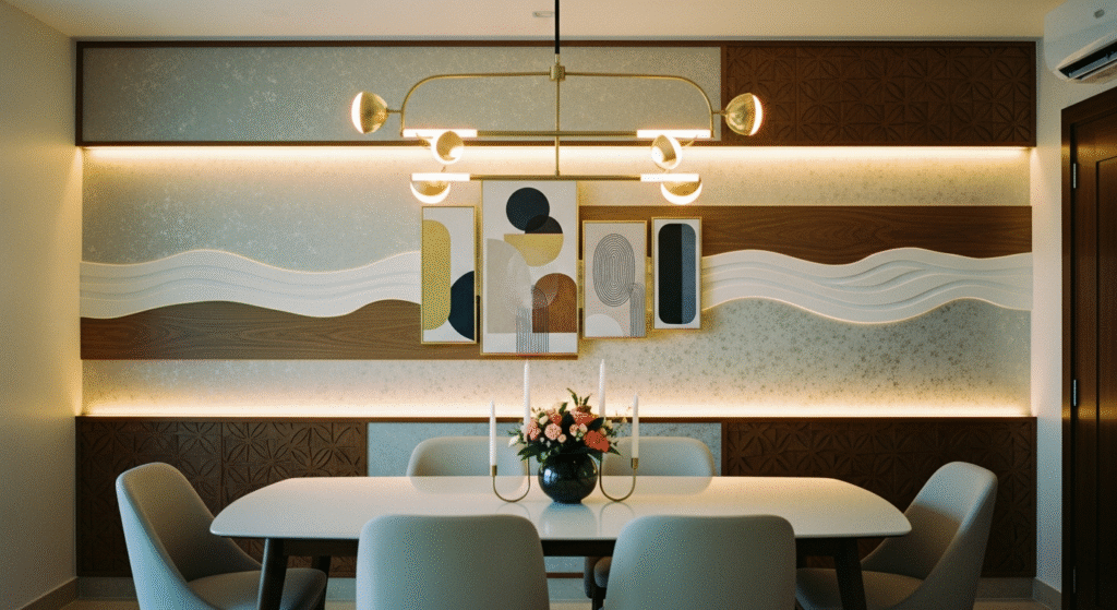 Solution: Tray ceilings, wooden beams, ya false ceiling ek invisible hug dete hain aapke dining ko—yeh subtly kehta hai, “Yeh mera special space hai.”