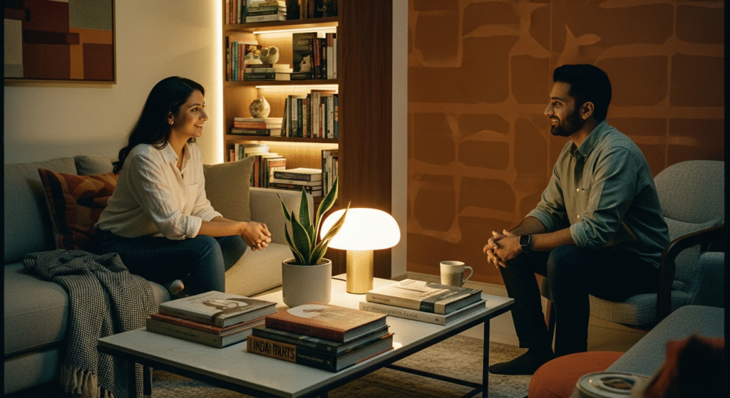 Don’t just fill space. Create pause points. A mini bookshelf or meaningful coffee table books can spark connections.