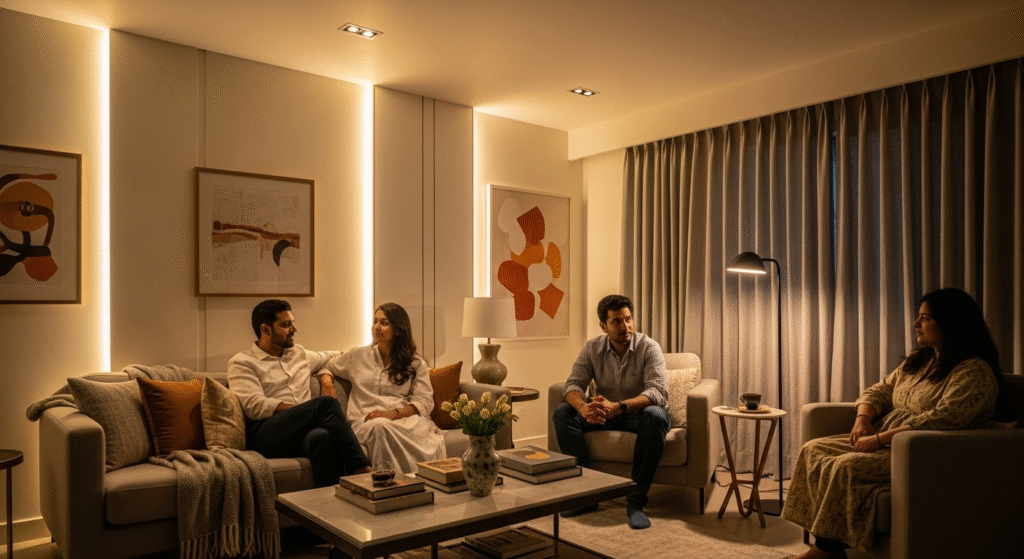 Downlighters, strip lights behind panels, soft lamp corners — it adds luxury without shouting.