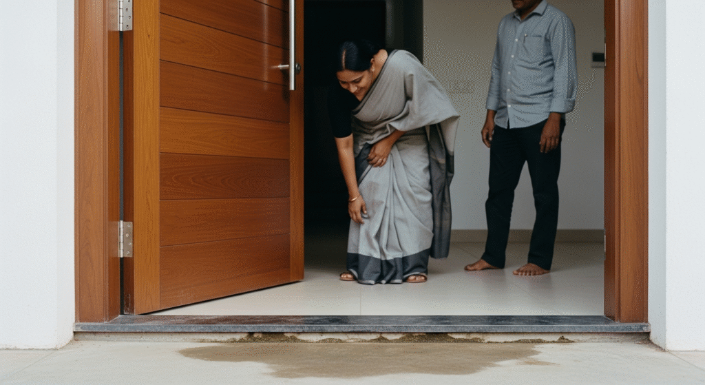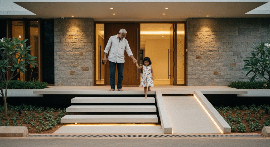 Solution: Subtle level changes with ramp + steps combo, concealed drainage channels, and threshold detailing jo both Vastu & waterproofing win deti hai.