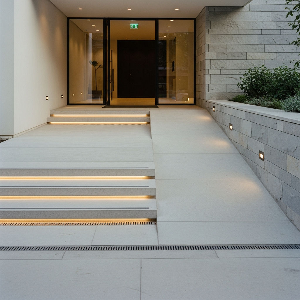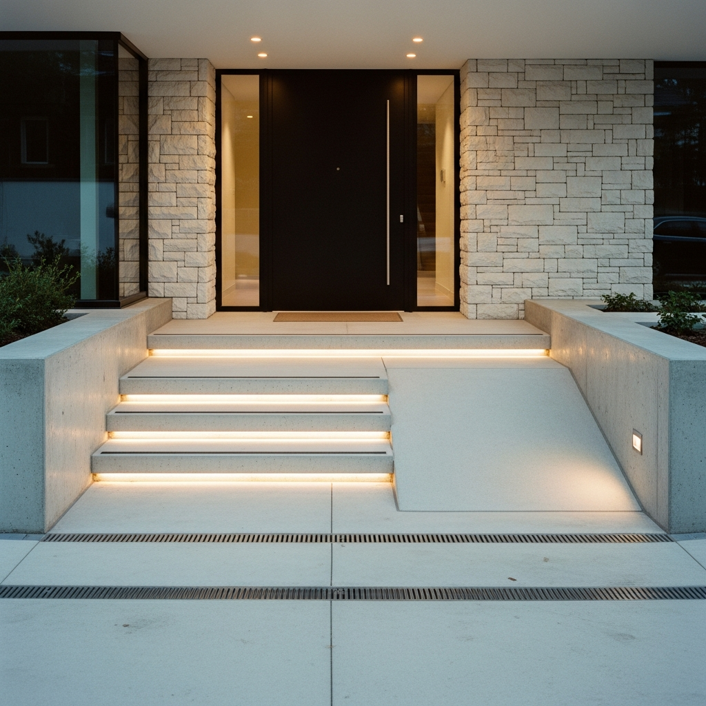 Pro Tip: Concealed LED strip under threshold step for dramatic night-time appeal.