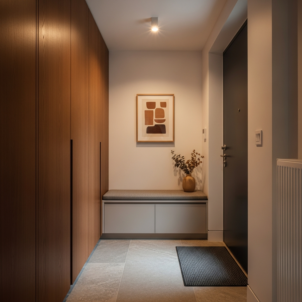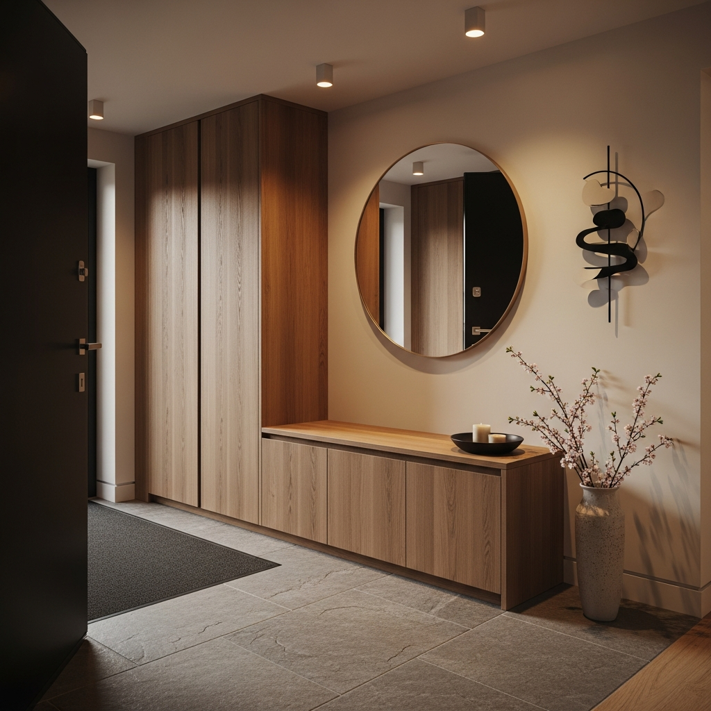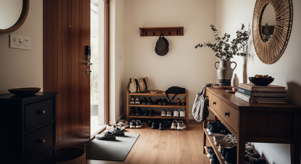 Architectural Lens: Space planning me recessed shoe cabinets, concealed storage benches, aur wall-hung décor ensure karta hai ki foyer functional bhi rahe aur grand bhi.