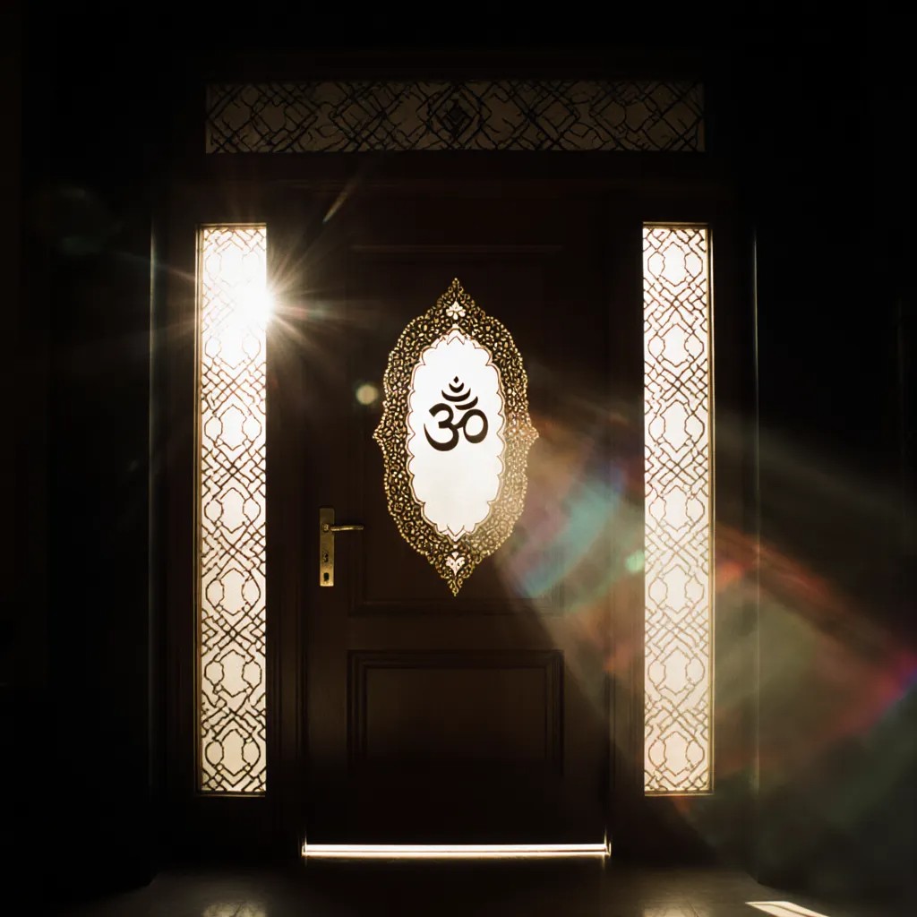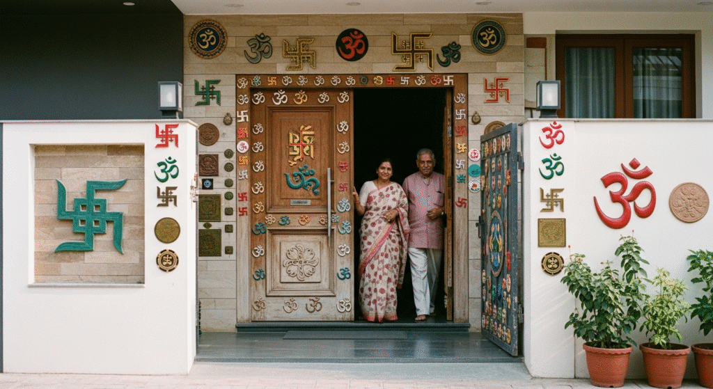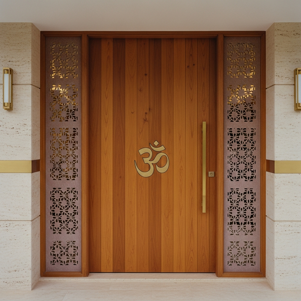 Design Integration: Carved door panels, brass inlay, laser-cut screens me Om/Swastik motifs subtly blend kiye jaa sakte hain.