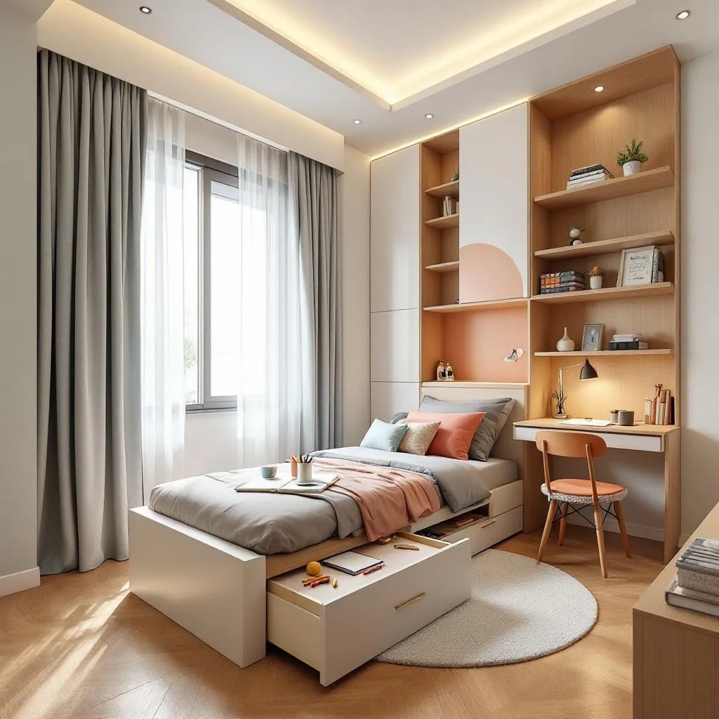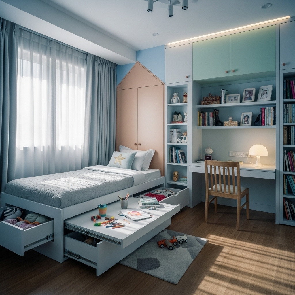 Bunk beds with storage drawers, ya bed ke neeche pull-out play table — ye furniture aapke bachche ke room ko space ka magician bana deta hai.