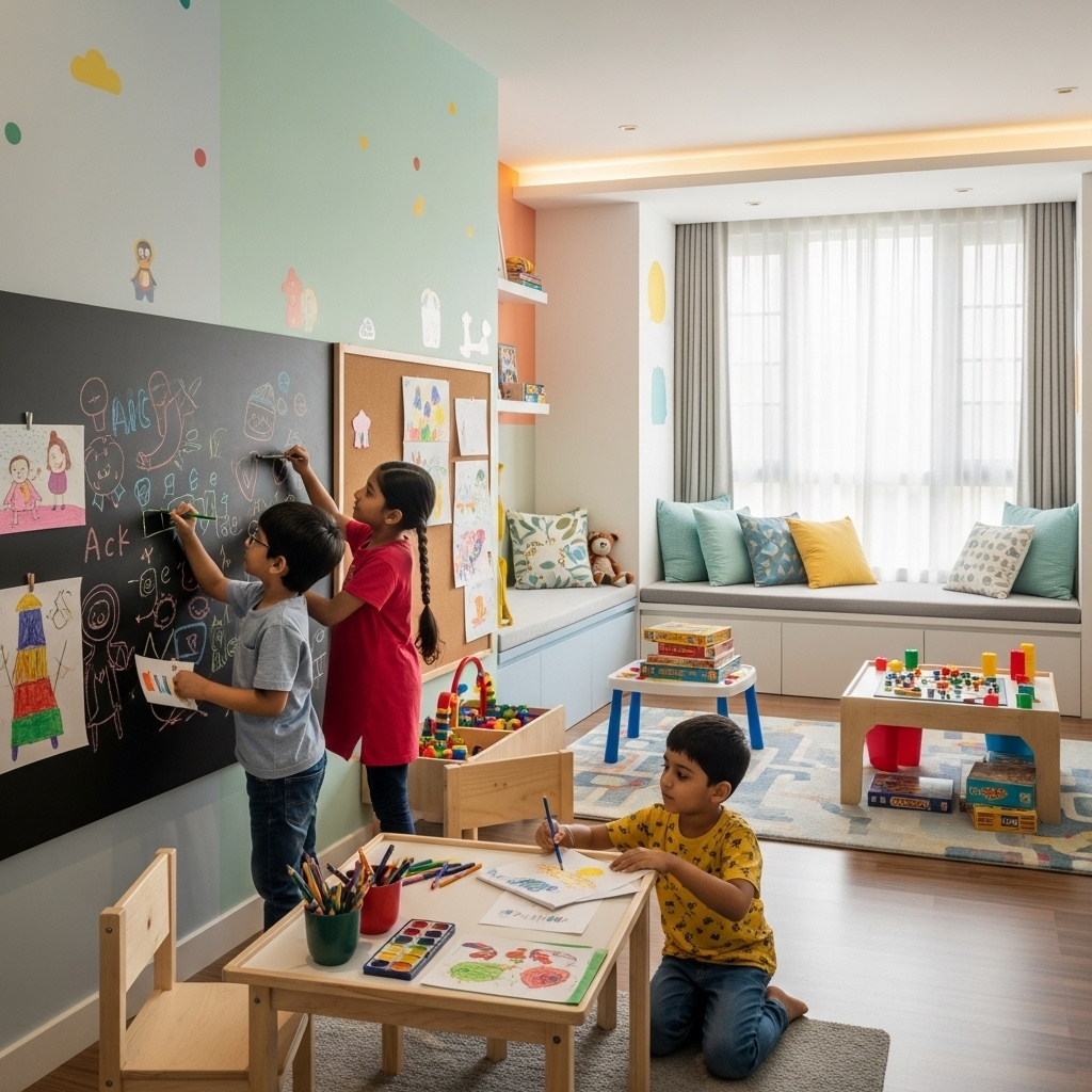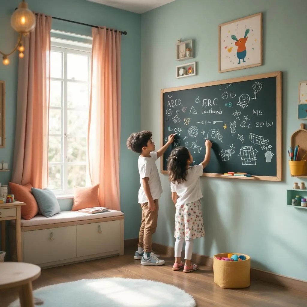 Plain walls boring hoti hain. Chalkboard paint, whiteboard panels, magnetic boards — bachche apni soch ko openly express karte hain.