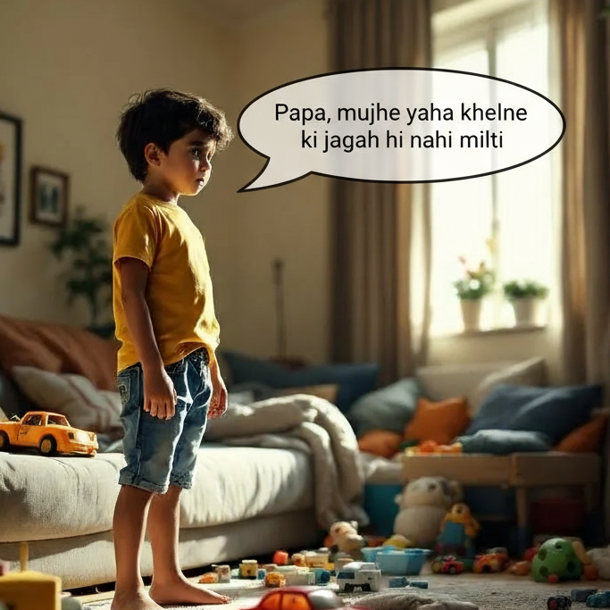 Pain point: Galat furniture placement se activity ka area ban hi nahi pata, aur bachche har jagah toys faila dete hain.